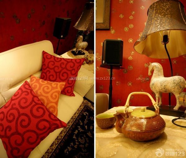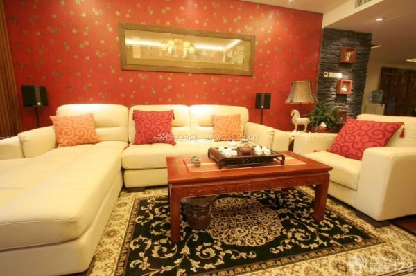 大紅的背景墻,白色的沙發和古典風的茶幾,使整個客廳顯得十分大氣。