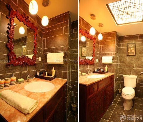 灰色的墻磚,大理石臺面,雕花的鏡子,古意盎然。