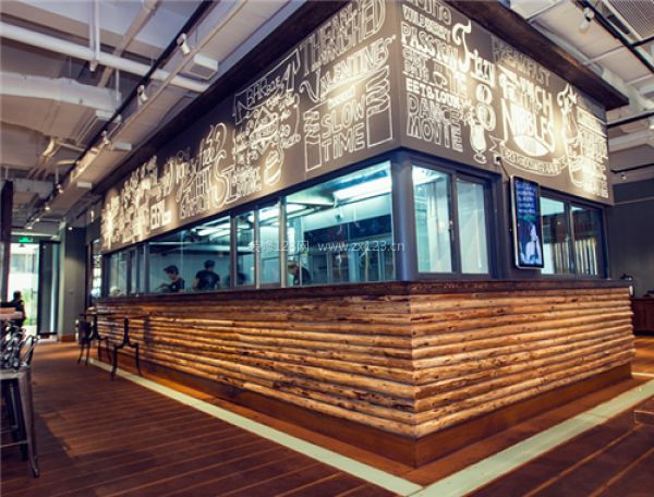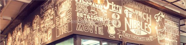 廚房上部采用了黑板粉筆字的創意,畫手架著梯子在黑色墻壁上作畫,粉筆畫部分可以反復擦寫,根據餐廳不同時段不同主題,更換內容。