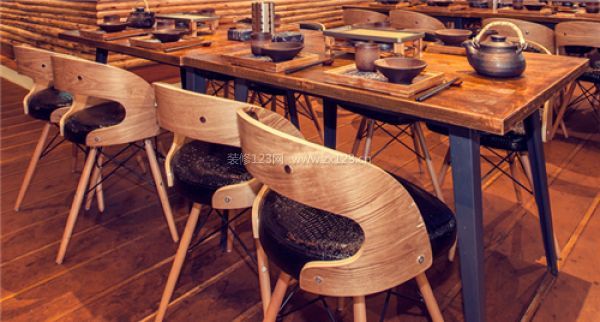 新木老做餐廳中的桌子都是鐵藝和木的結合,鐵藝桌腿,異形折邊,桌面采用風化木仿舊,質感與地面以及餐具十分接近,餐桌制作體現了傳家的采購和工廠定制能力。
