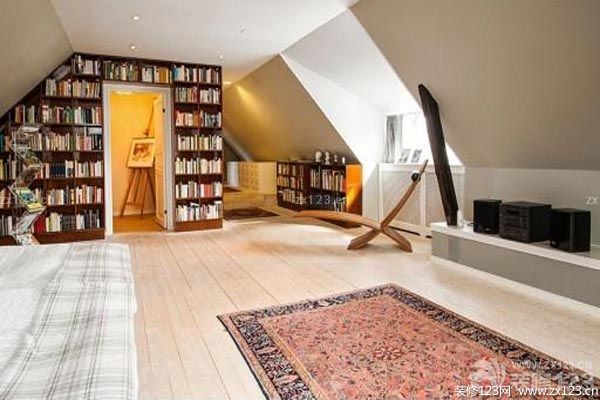 如果主人計劃將不規則的房間改造成書房,可根據墻的高度做一個階梯書架,漸漸下落的階梯和傾斜的墻面能夠形成漂亮的弧線,空間會變得開闊起來。如果屋頂傾斜度太大,可以考慮安裝地臺改造成休閑區,在地臺上隨意地擺幾個靠墊,邀親朋好友在這里喝茶、聊天也是一種享受。