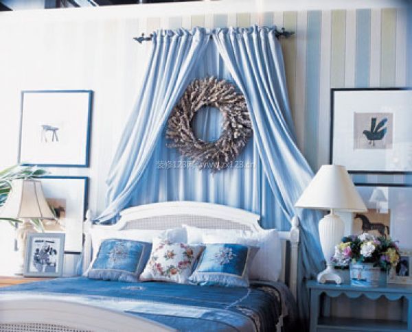 空間說話:空間結(jié)構(gòu)以直白為主,在沒有任何遮擋的床具上方安裝床幔,可彌補視線上的空曠,床頭的矮柜上即使裝飾再多,也達不到如此矚目的效果。配合床幔的色彩與功能,在壁紙和床具的選擇上也采用柔和的藍調(diào)與溫和的木質(zhì)配合。