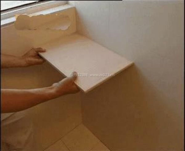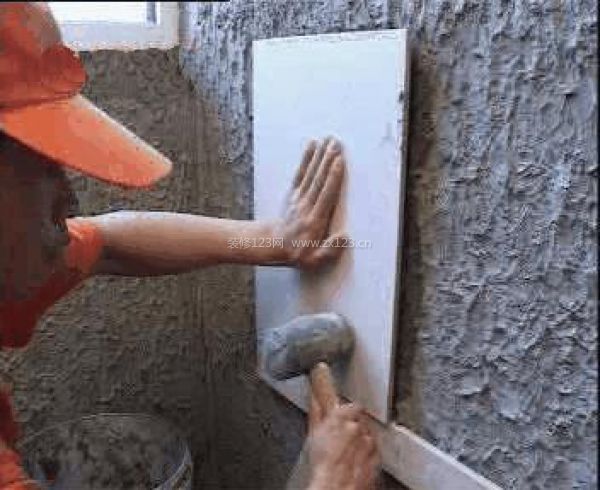 第二步:把滿批水泥的磚沿托板貼上墻,用橡皮錘敲打