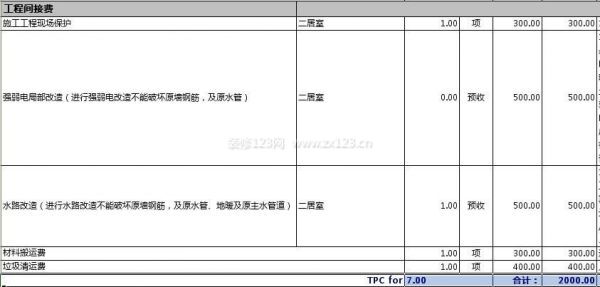 施工保護費,垃圾清運費,材料運輸費,除過這三項最好不要有其他費用,比如有的公司什么磨損費,巧立名目多得很。所有工程費用總和是32823元,其中還有一千的水電預收,再加上管理費10%,最后來中鐵的130平方半包為36106元。
