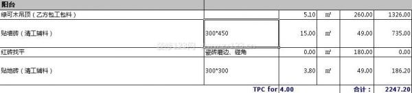 再看陽臺,墻磚地磚,吊頂,裝修公司負責貼磚,綠可木吊頂包工包料,業主買磚就行,看詳細預算