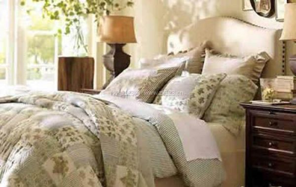 臥室這張大床從遠處看來,好像床頭是藤制的材料,其實床頭真正的材料是布藝,只是有藤制品的圖案。