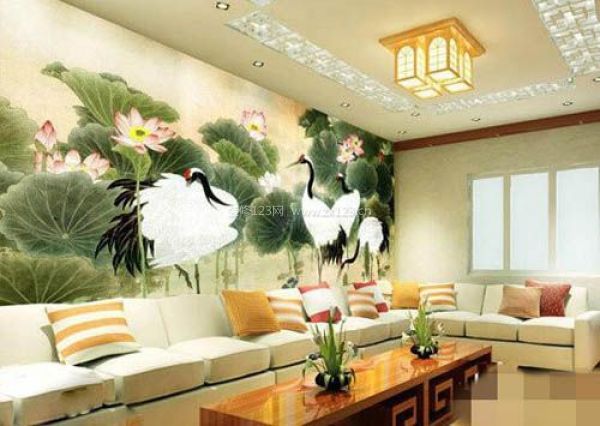 完美的中式風格彩繪沙發背景墻