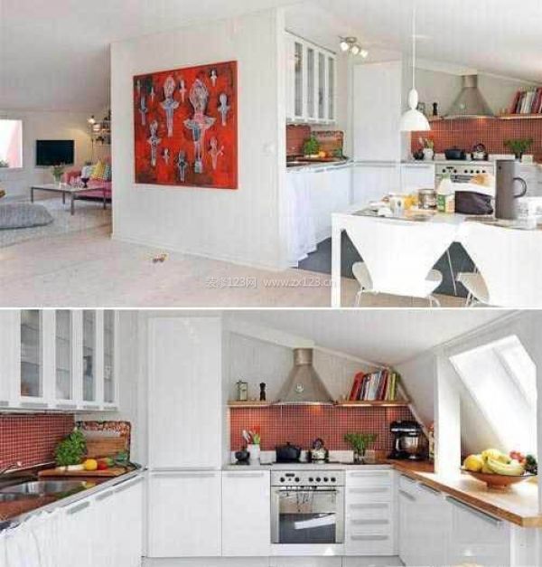 一幅紅色搶眼的現代主義抽象畫裝飾著白色的墻面,豐富了自上而下都只有白色的單調空間。紅色馬賽克瓷磚拼貼出貫穿廚房的中軸紐帶,U型廚柜組合擴大了廚房內的活動空間。