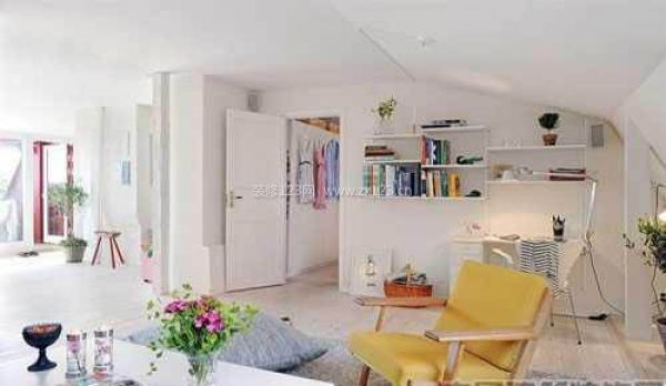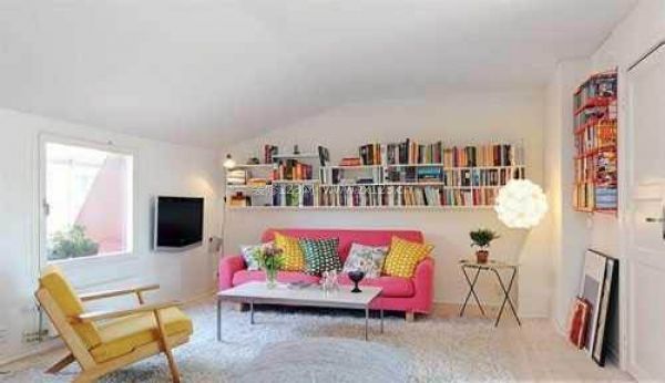 客廳里墻面與地面都繼續沿用白色,潔凈純白的國度里五彩的軟裝飾點亮空間。粉紅色的沙發配以圓點抱枕,顯得俏皮可愛。
