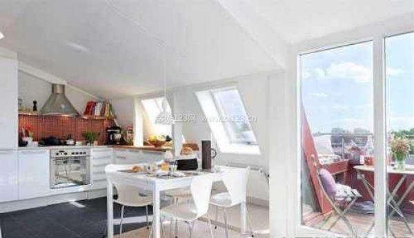 開放式的餐廳與廚房緊鄰陽臺,黑色地磚從地域上將廚房與餐廳分隔開,北歐風格里經典的白色被大量的使用于墻面和家具上。兩扇大窗戶以及陽臺的維拉門沒有任何窗簾的裝飾,讓自然光毫無阻撓的進入室內,因此餐廳內的人造光源只有餐桌上方的一盞吊燈。