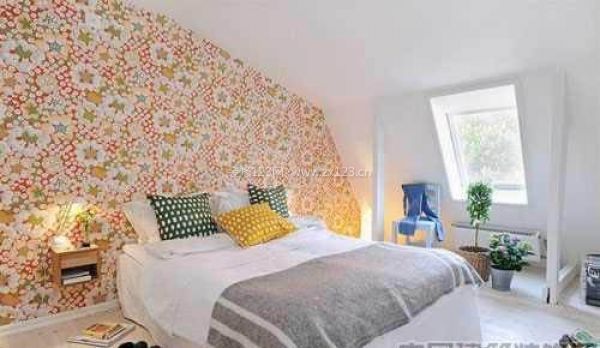 美麗的花卉圖案壁紙裝飾整面床頭背景墻,讓寧靜舒適的白色空間多了幾分鮮活感,再搭配上黑色和黃色的圓點抱枕更顯年輕活潑。