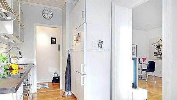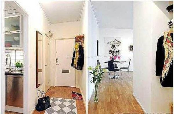 入戶后是條長長的過道。過道的盡頭有餐桌和以赫本為主題的裝飾畫。風格簡約而干凈,非常適合年輕的白領。進門的小走廊以及從玄關看客廳。