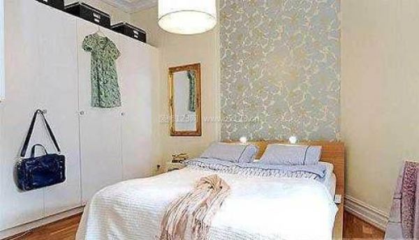 臥室在房間的盡頭,包括一張大床和大衣柜。定制的大衣柜,可容納大量的衣物,主人家也是個愛美的女孩。占了一面墻的大衣柜保證了充足的儲物空間,頂部保留了適當的儲存空間,可以把一些不看的書或出差旅游用的大箱子,床頭的墻壁被漆成白色碎花圖案。