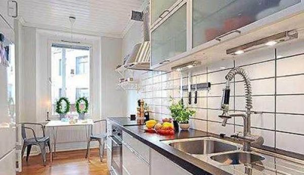 廚房使用整體式櫥柜,井井有條。在小廚房的右邊,放置一張小餐桌,輕松就餐。