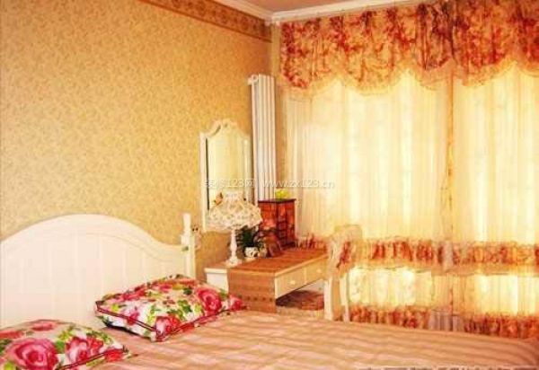 臥室垂感窗簾成就完美混搭,主臥室同樣是田園風格,但靈感取自韓式田園,浪漫而靜謐,是個休息消閑的理想居室。臥室的窗簾采用的是典型的田園花朵圖案,分里外兩層,里層是棉布的窗簾,外層是純蕾絲的紗簾,垂感相當好,與房間的碎花立體壁紙混搭起來,很好地哄托出暖黃溫馨的格調。