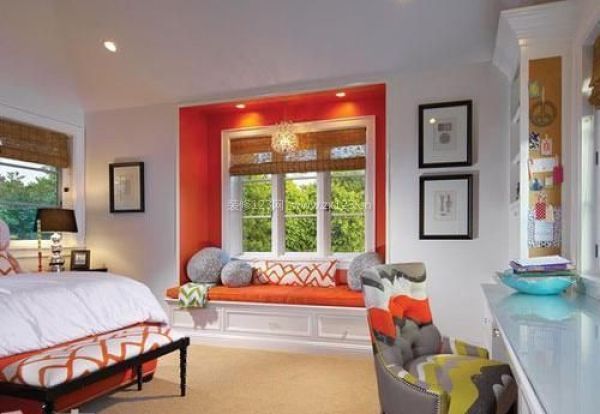 鮮艷的色彩能給空間增加活力感,這個飄窗選用和床品同色系的橙色,使房間整體風格得到統一。飄窗的上方還掛上了別致的吊燈,營造了溫馨的氛圍。