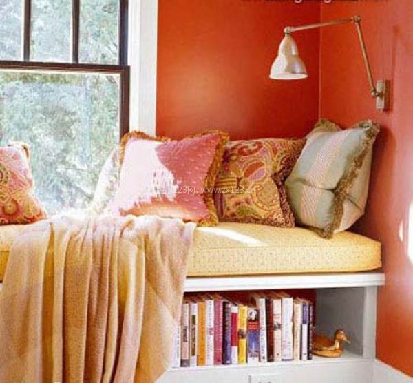 如果在裝修初期就想好了要利用飄窗做成一個(gè)沙發(fā),那么可以同時(shí)改造飄窗旁邊的墻面。用粉色裝飾飄窗,搭配溫馨的墻燈,飄窗會(huì)充滿柔情。飄窗旁邊的墻面可以改造成入墻式的收納柜,一邊放書本,另一邊可以展示你各式各樣的收藏。