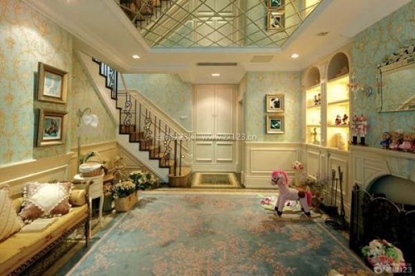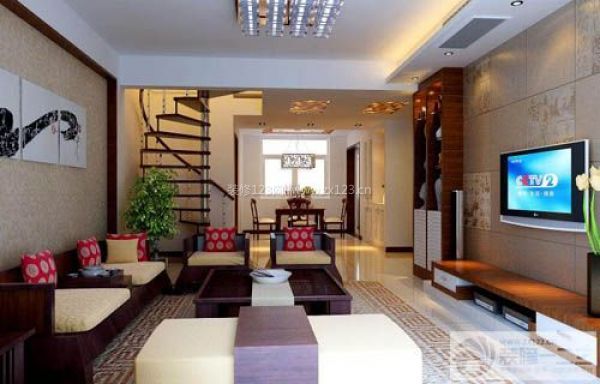 一般客廳部分都是中空設計,使樓上樓下有效結為一體,有利于一樓的采光、通風效果,更有利于家庭人員間的交流溝通,也使室內有了一定的高差,這種立體空間,頓顯一份尊貴和大氣。正由于有了足夠的層高落差,設計時要注意彰顯這種豪華感。如在做吊頂時對燈具的款式的選擇面更大一些,可以選擇一些高檔的豪華燈具,以體現主人的生活和思想的品位。