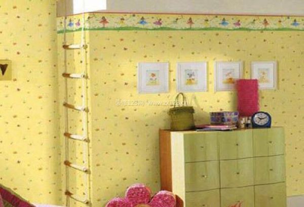 嫩黃色的純紙壁紙非常的符合小女孩的心愿,小孩子天生對顏色哦敏感導致了她們一定會喜歡這種鮮艷的顏色的。再加上小小的卡通圖案的點綴,就像是整間臥室都處在一個夢幻般的世界中一樣。