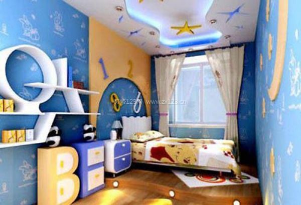 整個裝修風格呈現出一種童趣感,藍色的壁紙上卡通圖案的點綴使這種感覺更加的凸顯,總之這款壁紙是最具有兒童趣味的壁紙,特別適合兒童房的壁紙。