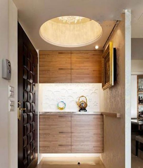 這個設(shè)計是適合家里有比較多的吊頂設(shè)計,看得出來這個圓形造型做得比較深,如果客廳處有對應相似的吊頂?shù)脑挘w看起來會很有層次感,圓形造型的燈光襯托,會讓整個玄關(guān)顯得高很多。