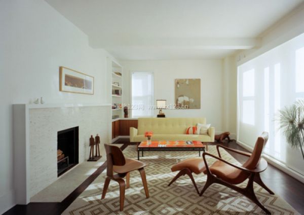 整個家居空間以白色作為主色調,配以樣式簡潔的家具,淡黃色的沙發,溫暖的壁爐,使整個淺色空間有了溫度。