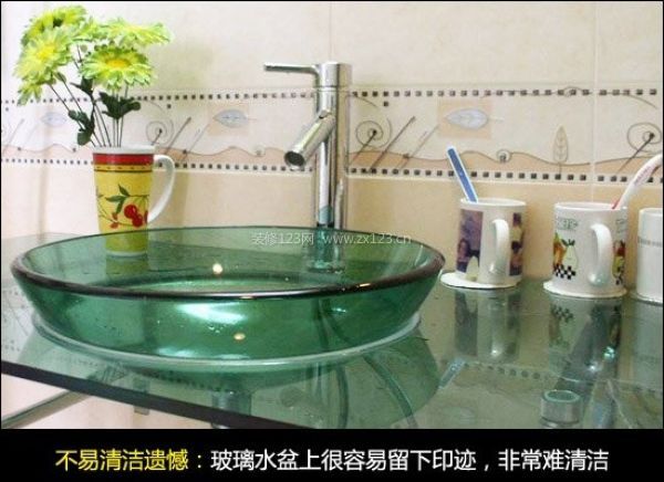 玻璃臺盆時尚大氣,可安裝后卻讓人懊悔不已,北方水堿大,水盆上很容易留下印跡,非常難清潔。
