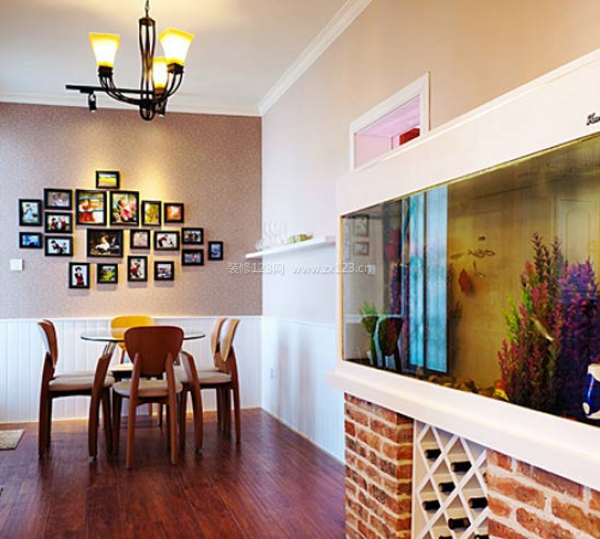 照片堆砌成為餐廳裝修設計的背景墻,不但大方好看,還在小小墻面展現家庭生活的點點樂趣。內嵌式的浴缸和紅酒架為空間增加了許多情趣。