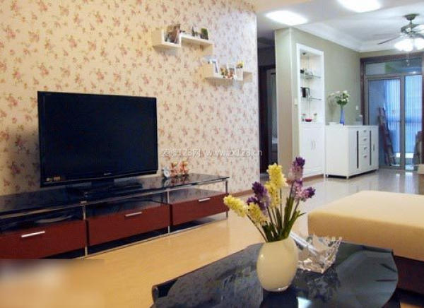懸空的水泥板瑞然不能放置太多的東西,但是放置家中常用的小物品還是可以的,電視背景墻沒有設計的太復雜,重復的小細花就成為裝飾的美化、