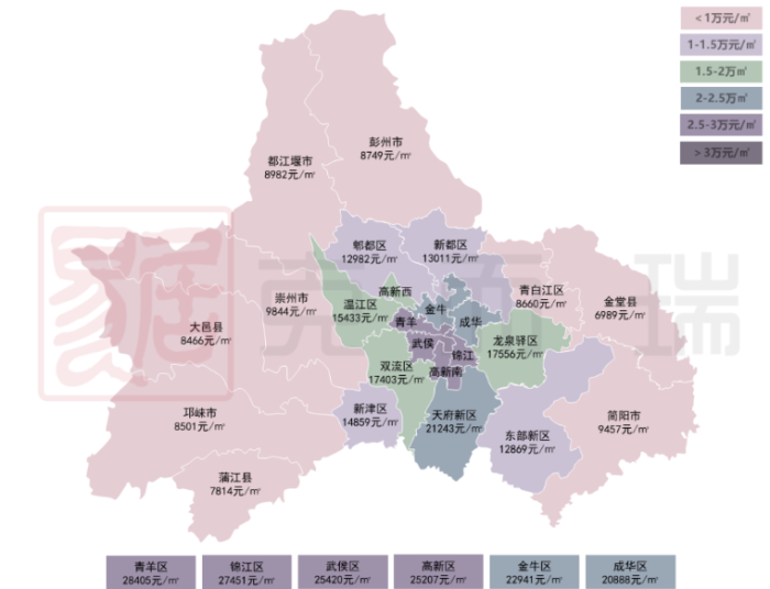 均價在2.5-3w檔的,主要是青羊區、錦江區、武侯區、高新區四個區域,錦江區大部分新盤門檻較高,基本在2.8w及以上,高新區除人才公寓項目外,大部分新盤均價在2.9w及以上,武侯區新盤主要集中在武侯新城,均價在2.2-3w之間。