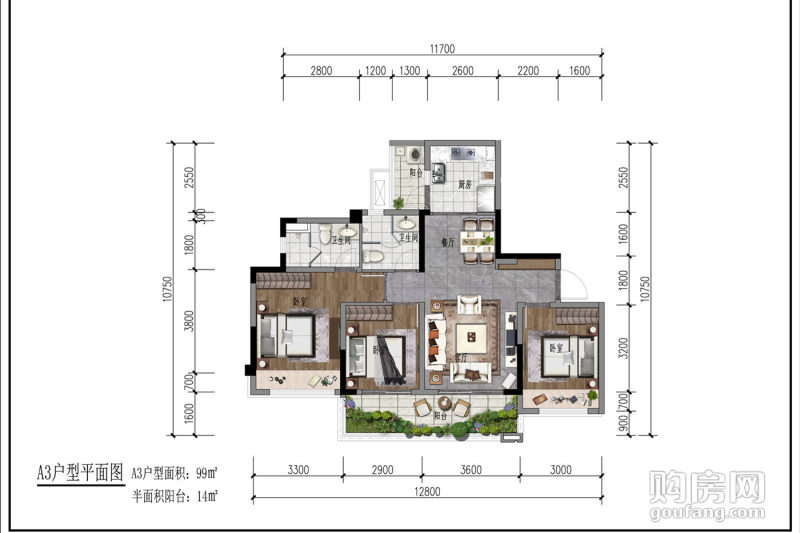 【戶型A3】:3室2廳,朝向為南,建面約99㎡,參考單價約22000/㎡