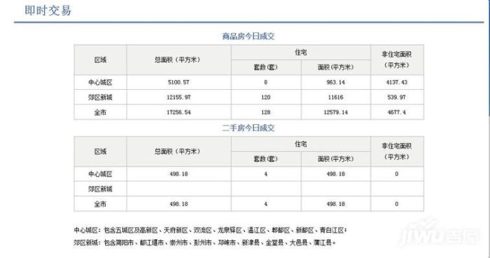 7月31日,成都市全市商品房成交(備案)總面積17256.54平方米,其中其中商品住宅成交(備案)128套,商品住宅成交(備案)面積12579.14平方米。二手房成交(備案)總面積498.18方米,其中二手住宅成交備4套,二手住宅成交(備案)面積498.18平方米。