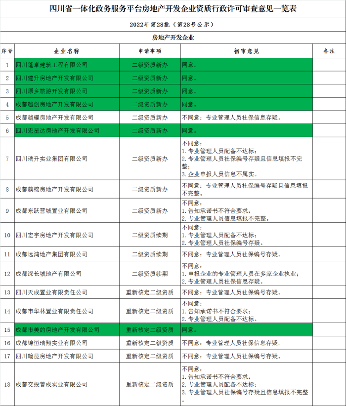 近期,據成都市住建局官網發布的《關于四川省一體化政府服務平臺房地產開發企業資質行政許可審查意見的公示(2022年第28號) 》,18家房地產開發企業二級資質審核的初步意見已出爐,其中僅四川蓬卓建筑工程有限公司、四川建升房地產開發有限公司、四川原鄉旅游開發有限公司、成都越創房地產開發有限公司、四川宏星達房地產開發有限公司、成都市美的房地產開發有限公司六家公司的初審意見已為同意,因其他公司都存在一定問題,目前企業二級資質審核都已被否決。