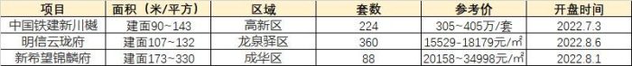 8月剛起航,樓市再迎好消息,據目前統計情況來看,共計有12個項目開盤,共計1797套房源。目前較有熱度樓盤有3個,分別為高新區 中國鐵建新川樾、龍泉驛區 明信云瓏府 、成華區 新希望錦麟府,具體情況如下: