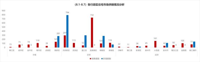 據有關數據顯示,8月1日-8月7日,成都住宅市場天府新區等近郊供銷兩旺,高新區等主城供銷雙降,都江堰市等遠郊供跌銷漲。值得一提的是,龍泉驛區等近郊在上周(8.1-8.7)為住宅主力供銷區,具體如下: