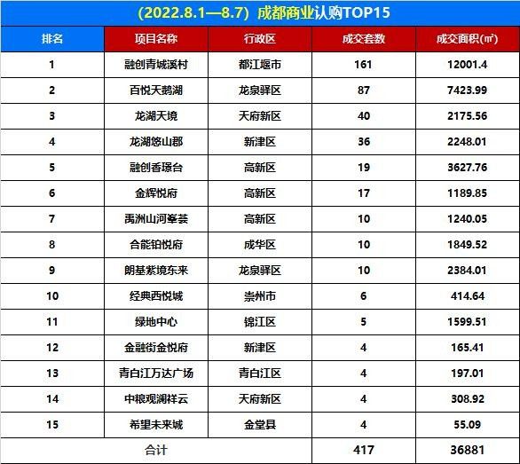 據有關數據顯示,2022年8月1日8月7日,成都商業TOP15銷售共計3.68萬㎡,其中包括融創香璟臺、金輝悅府、禹洲山河峯薈、合能鉑悅府、朗基紫境東來、綠地中心主城5個樓盤;天鵝湖、龍湖天境、朗基紫境東來、中糧觀瀾祥云近郊4個樓盤;融創青城溪村、龍湖悠山郡、經典西悅城、金融街金悅府、青白江萬達廣場、希望未來城遠郊6個樓盤。值得一提的是,融創青城溪村、百悅天鵝湖、龍湖天境被購房者深受喜愛,一躍成為榜單前三位,具體如下: