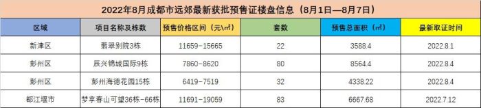 從上圖來看,最新一期的喜提預售證的樓盤分為彭州區兩盤,新津區、都江堰市各一盤。