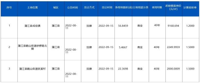 蒲江縣第一宗供應(yīng)商業(yè)用地位于蒲江縣成佳鎮(zhèn),在2022年8月11日采取掛牌進(jìn)行告示,將于2022年9月15日出讓,土地被作為商業(yè)用地,使用年限40年,當(dāng)前起始樓面地價為9168.694㎡,土地項目凈用地面積為56.8459畝。