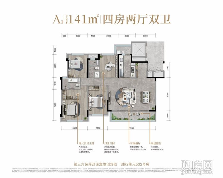 4室2廳2衛,A1 戶型 141㎡ 四房兩廳兩衛(4室2廳,141平,南北)