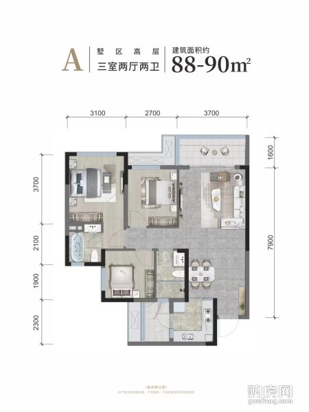 A戶型(3室2廳,89平,南)