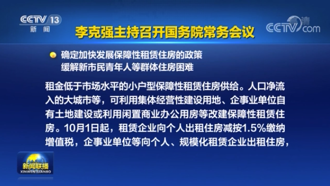 6月18日,國務院總理李克強主持召開國務院常務會議,決定從10月1日起,住房租賃企業向個人出租住房適用簡易計稅方法,按照5%征收率減按1.5%繳納增值稅;對企事業單位等向個人、專業化規模化住房租賃企業出租住房,減按4%稅率征收房產稅。
