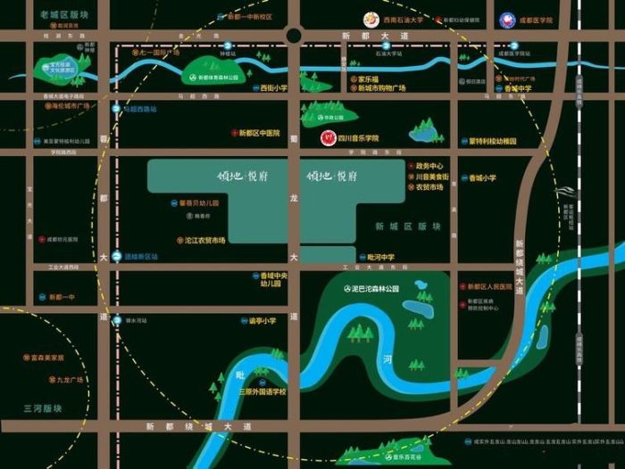地處政府重點打造的俠客島-川音文創園,該項目坐擁立體交通體系帶來的便利交通和成熟商業配套,未來在領地悅府附近將形成新城區高品質消費商圈。醫療資源有成都市新都區中醫醫院、新都區人民醫院、成都市新都區婦幼保健院等,保障家人健康。區域內還有新都利民學校、升庵中學、成都上美藝術學校、四川音樂學院(新都校區)、成都市新都區特殊教育學校等多所學校,護航孩子成長。公園配套有新都體育森林公園、新都區中央森林公園、毗河音樂文創公園、馬超東路市政公園等,生態資源豐富。住在這里,既可享受城市中心的繁華生活,又可擁有靜謐安逸生態生活